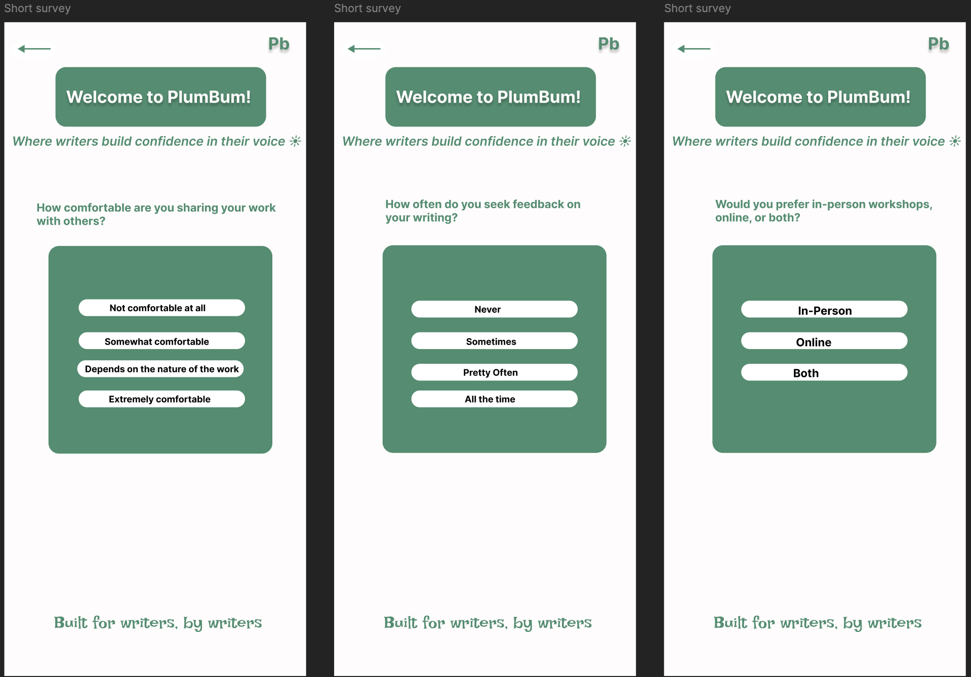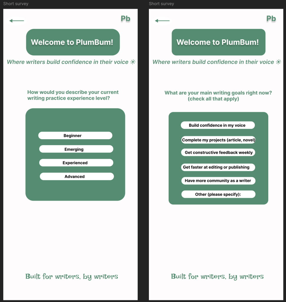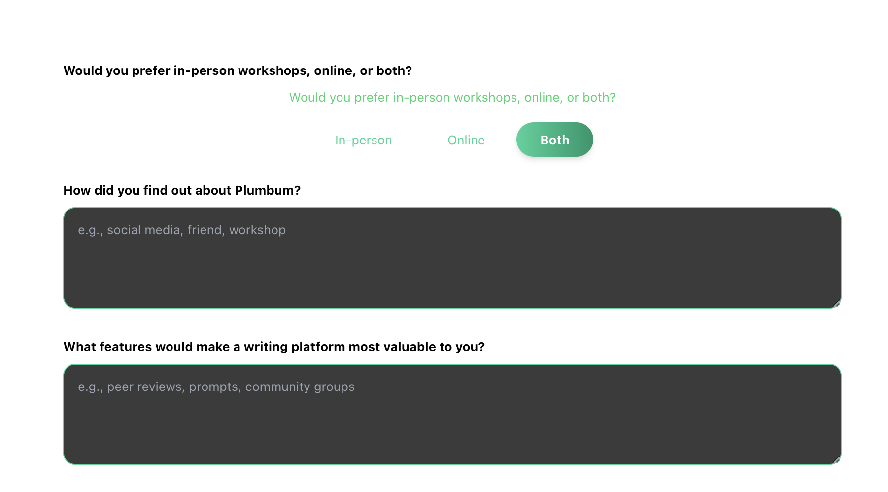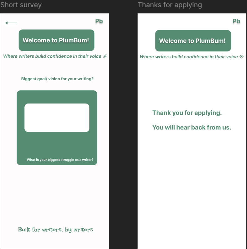 - Step 3: Format preference (in-person / online / both), how they heard about Plumbum, and an open text “what features would make a writing platform most valuable to you?”