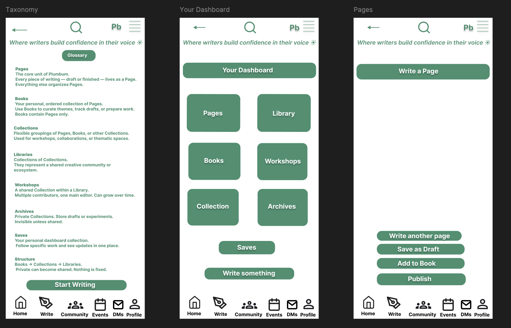 Why the split In mid-fi I had one feed doing two jobs: showing community activity and surfacing the writer’s own work. Members in usability sessions kept asking “where are MY pages?” — so I split the surface. Home stays social; Dashboard is the writer’s desk.