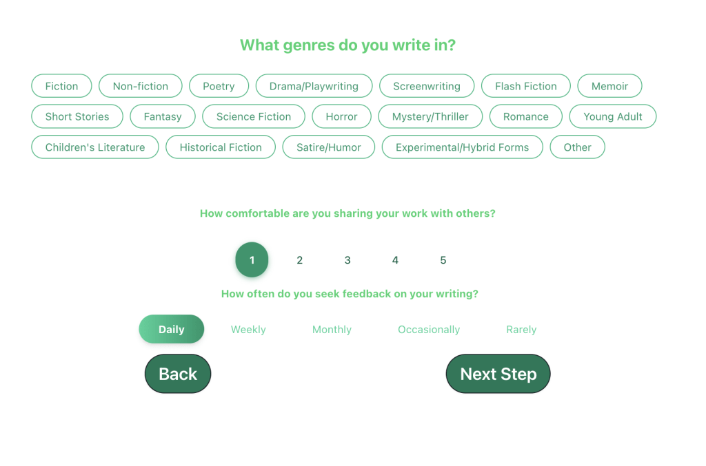 - Step 1: Genres (multi-select chips), comfort sharing (1–5 scale), feedback frequency (Daily → Rarely).