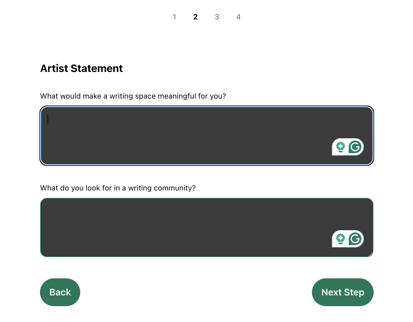 - Step 2: Artist statement — open text on “what would make a writing space meaningful for you?” and “what do you look for in a writing community?”