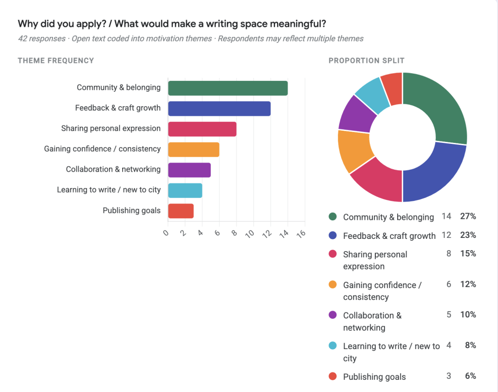 Community & belonging (27%) and feedback & craft growth (23%) were the top two reasons writers wanted in. Publishing was almost an afterthought (4%).