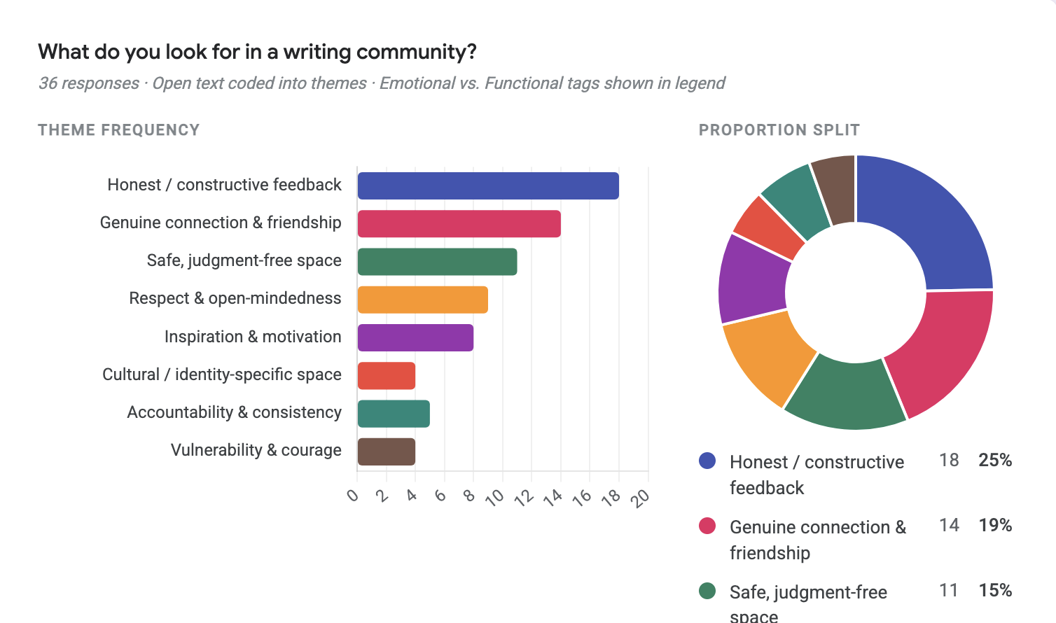 Honest/constructive feedback (25%), genuine connection (19%), and a safe judgment-free space (15%) made up nearly 60% of all themes.