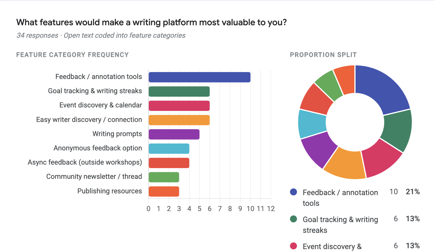 Feedback/annotation (21%) led every other category. Goal tracking, event discovery, and writer discovery tied for second.