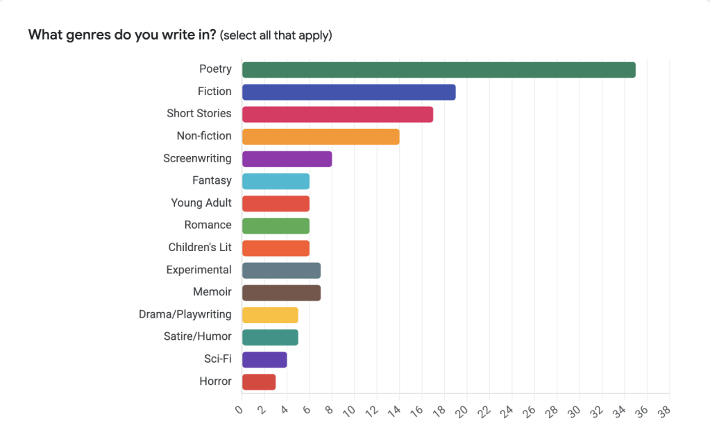 Poetry was nearly 2x the next genre. Fiction, short stories, and non-fiction filled out the mid-tier; screenwriting and memoir were the long tail.