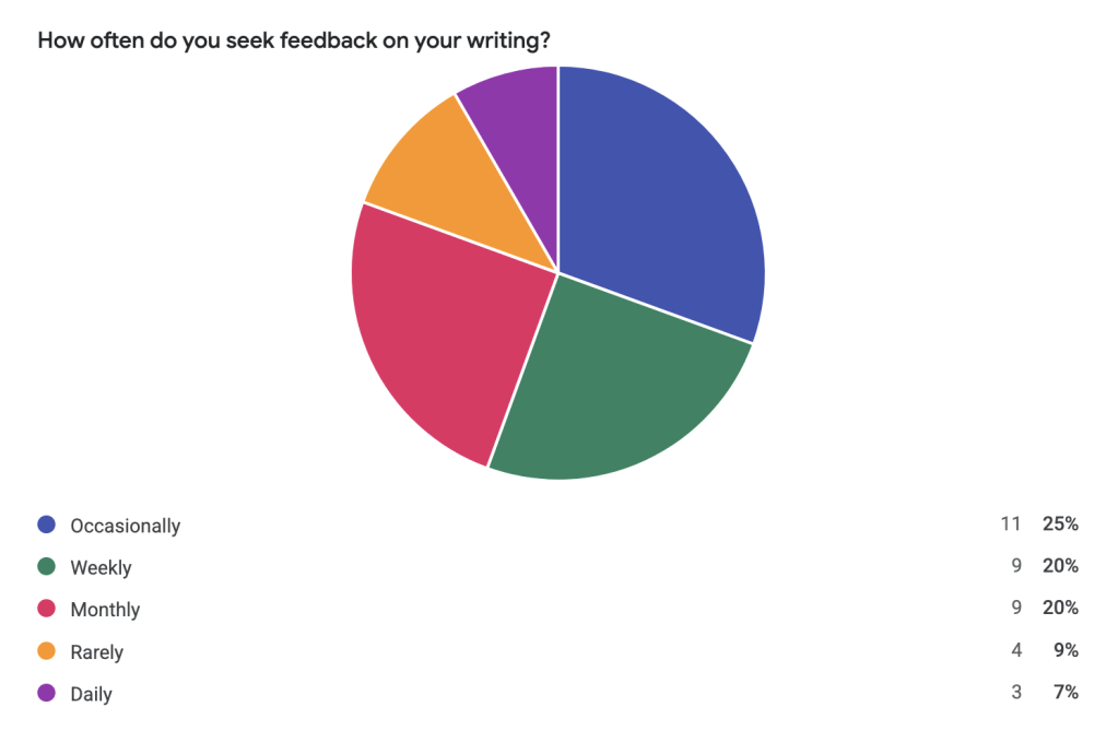 “Occasionally” (25%), “Weekly” (20%), and “Monthly” (20%) led. Only 7% sought feedback daily.