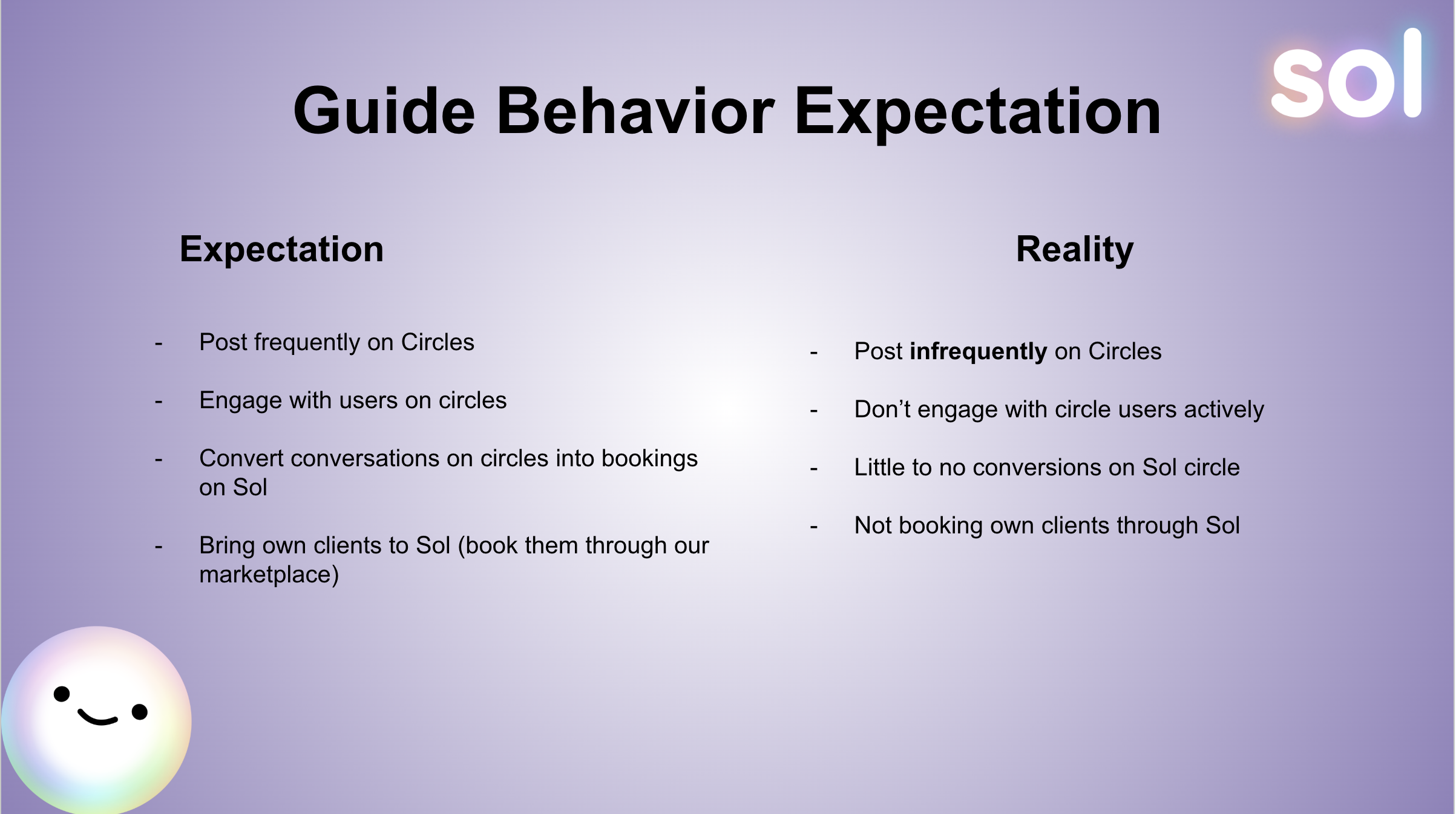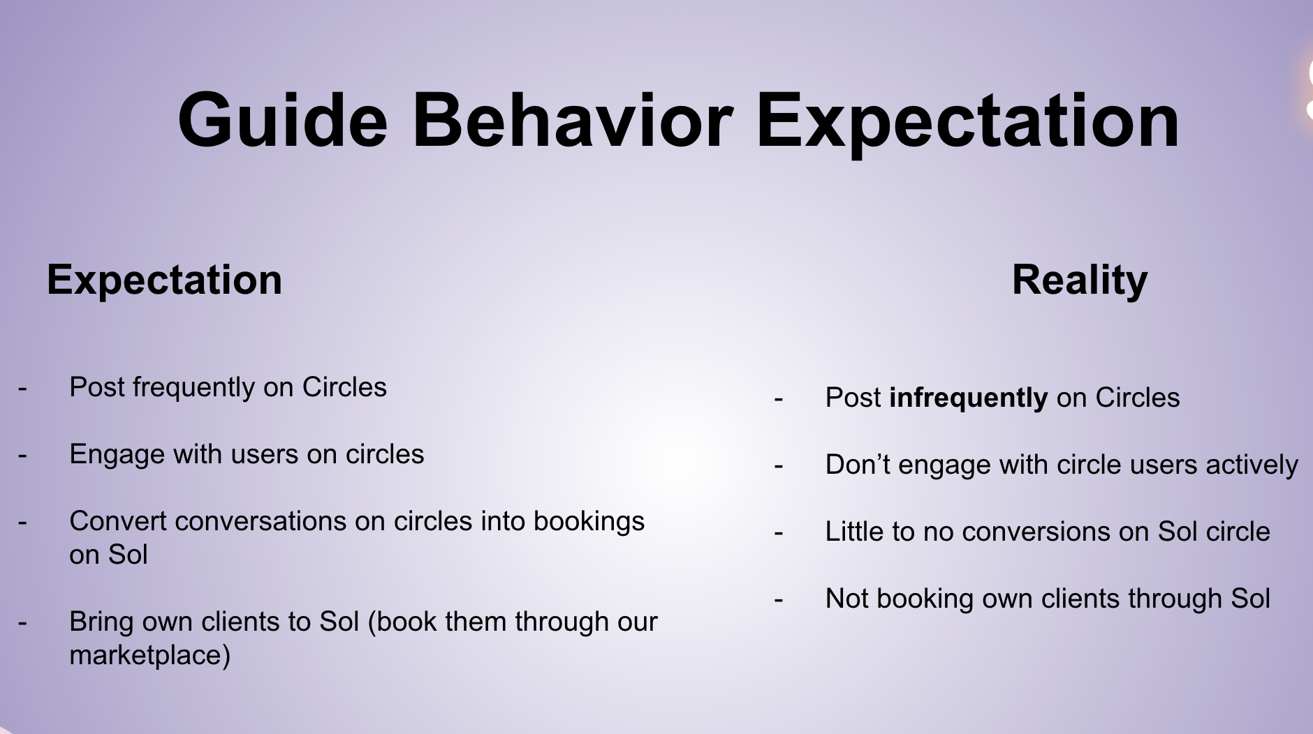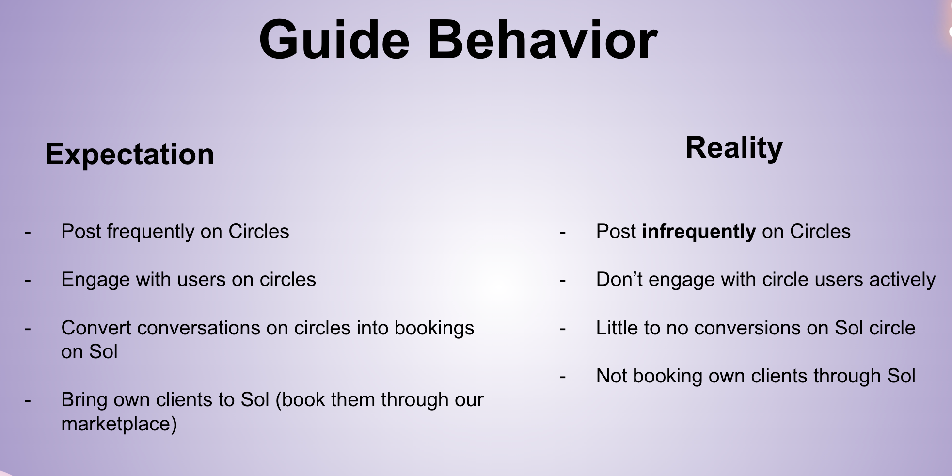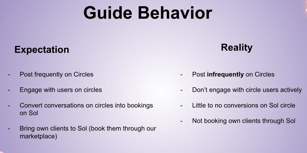 This also impacted guide motivation, leading them to not show up to Sol with enthusiasm.