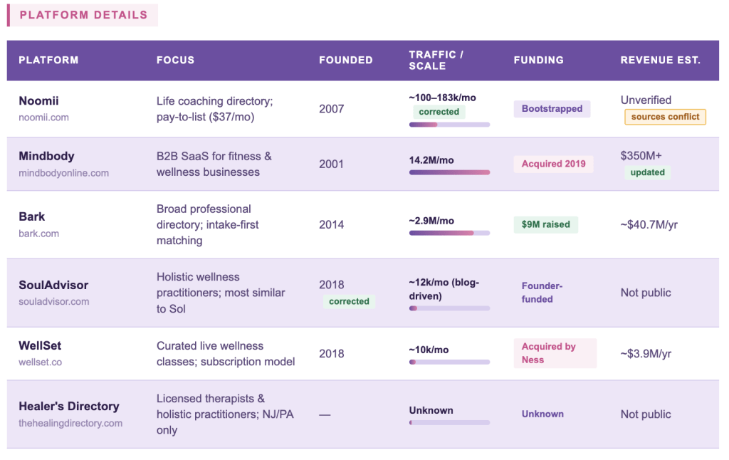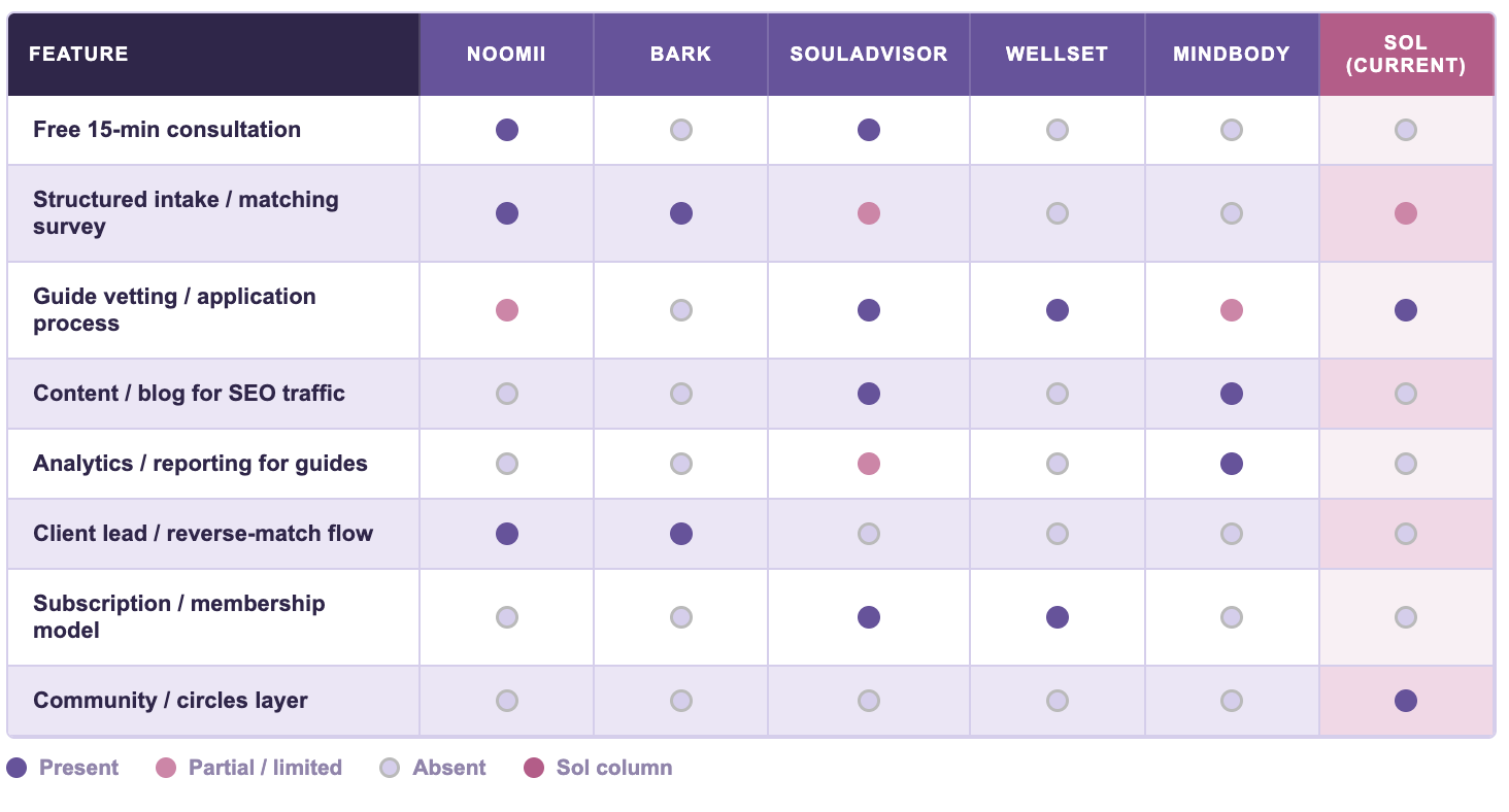 To better understand Sol’s positioning and structural friction points, I conducted a comparative analysis of other spiritual and wellness marketplaces.